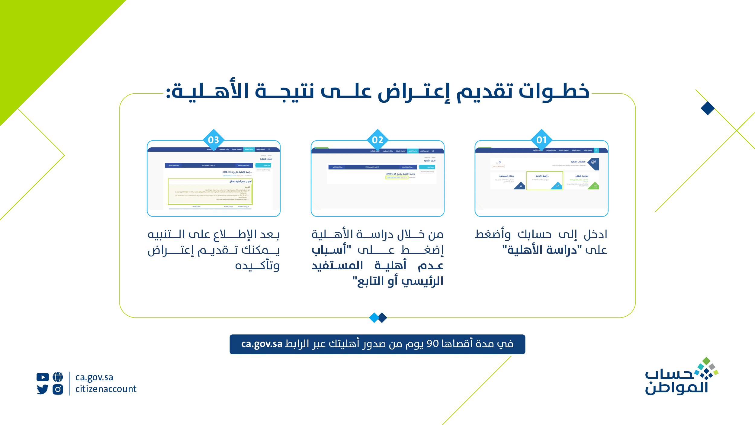 تعد أهلية المستفيد شرطاً أساسياً في حصول الفرد على مبلغ الدعم المنصرف في حساب المواطن، ولهذا ينتظر المواطنين في المملكة كل شهر بفارغ الصبر معرفة نتائج الأهلية في برنامج حساب المواطن، حيث أن عدم الأهلية معناه حرمان الفرد من الحصول على الدعم النقدي المقدم من البرنامج، ما لم يقم الفرد بتقديم اعتراض رسمي على سبب عدم الأهلية في البرنامج، وذلك في حالة ظهور نتيجة الأهلية بالغير مؤهل، وقد أتاح القائمين على برنامج حساب المواطنين أمام الأفراد الذين تظهر لهم نتائج الأهلية بغير المؤهل، القيام بتقديم اعتراض على حالة عدم الأهلية، وذلك من خلال القيام بالخطوات الاتية:-