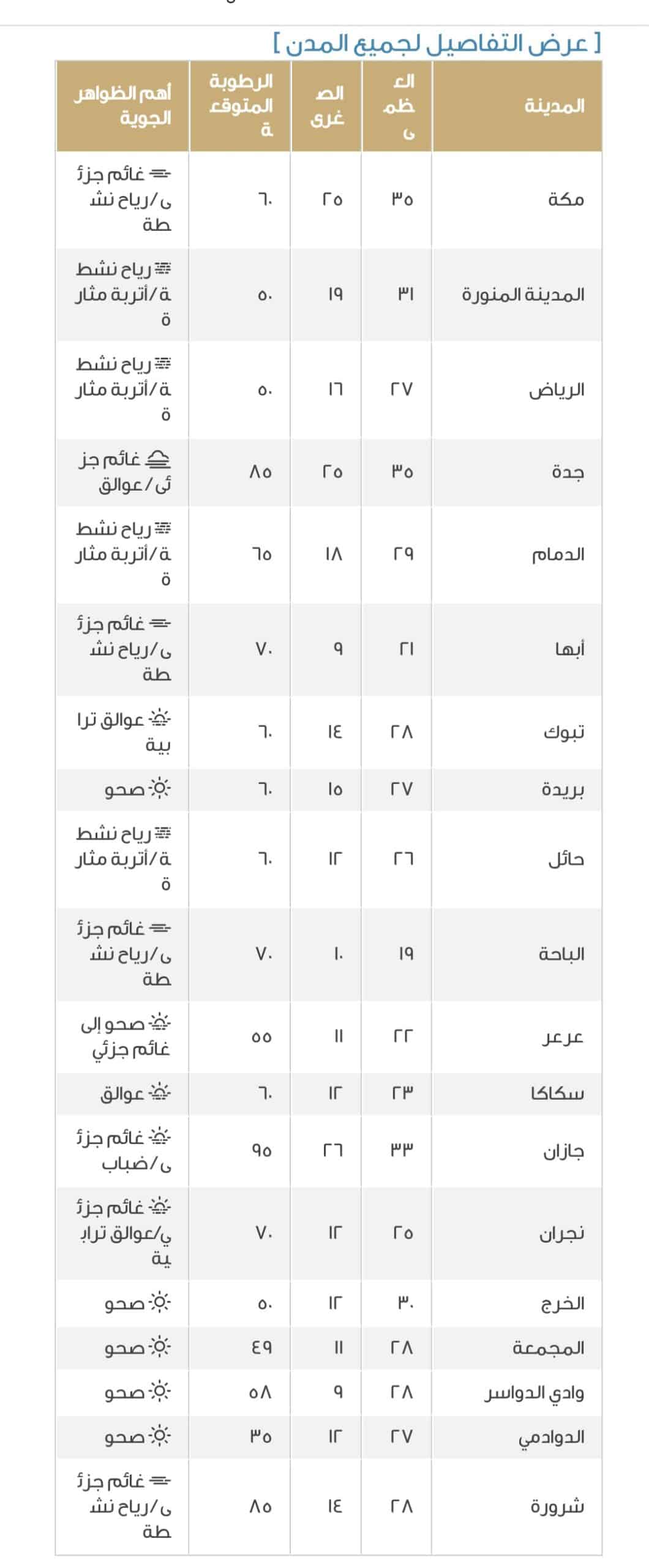 - في مدينة الباحة: العظمى 19 والصغرى 10 وتوقعات بأن يكون الطقس غائمًا جزئيًا مع وجود رياح نشطة.
