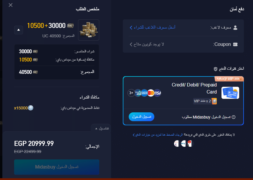 ويعتبر عرض شحن 30000 + 10500 شدة إضافية uc عبر Midasbuy من أقوى العروض الحالية التي يوفرها الموقع، والتي تمنح اللاعب نحو 40500 شدة دفعة واحدة، يمكنه من خلالهم شراء الكثير من العناصر الهامة من اسلحة قوية وازياء مميزة وسكنات حصرية.