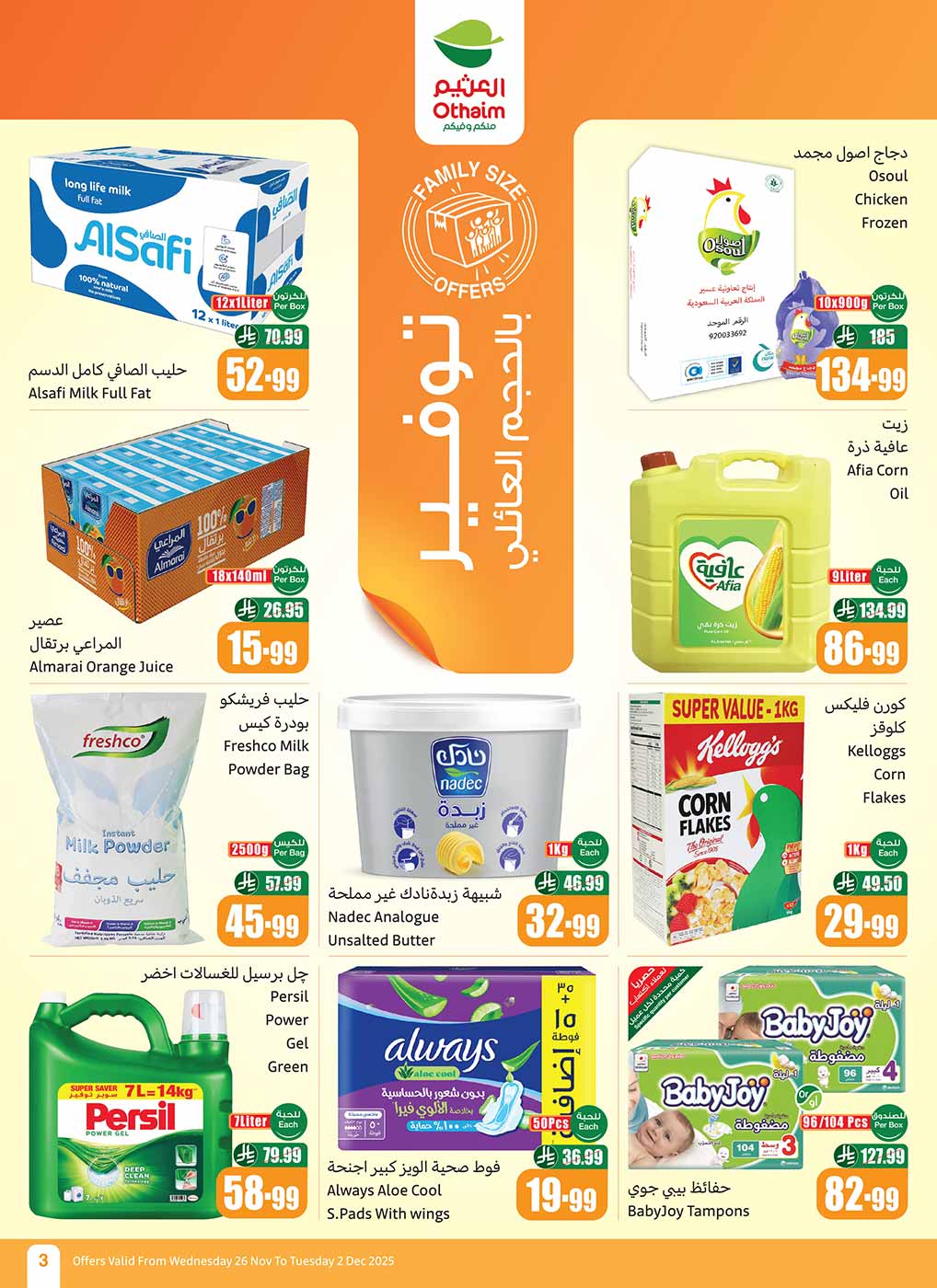 تستمر عروض العثيم التي انطلقت يوم الأربعاء 26 نوفمبر، والتي تنتهي يوم الثلاثاء الموافق 2 من شهر ديسمبر، حيث ركز العثيم هذا الأسبوع على المنتجات ذات الحجم العائلي لضمان توفير أكبر للميزانية، مع تخفيضات غير مسبوقة على الأرز والدجاج وزيوت الطبخ، ومن بينها: