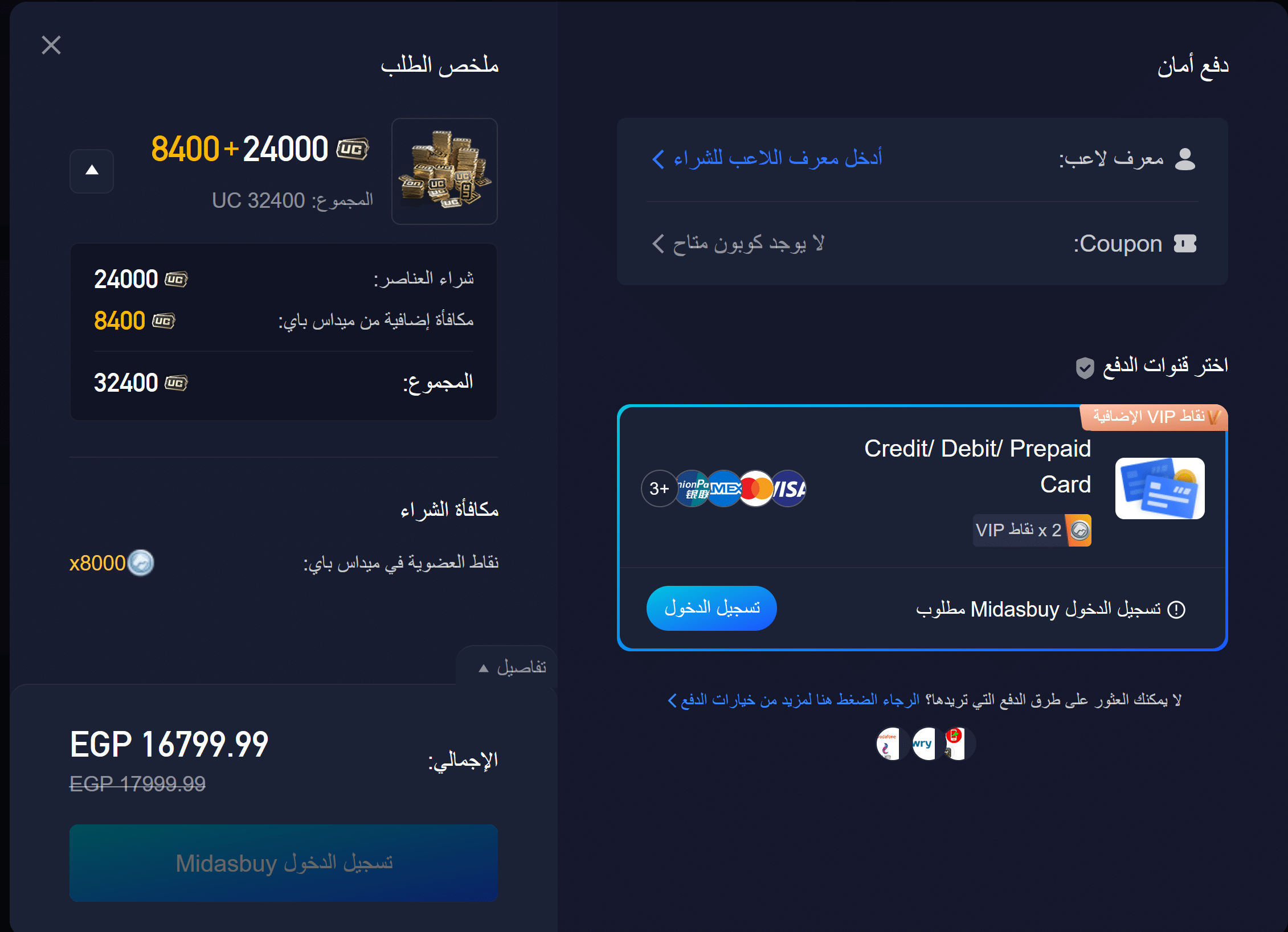 من الآن لا تحمل هم أمر شحن شدات pubg، لآنه من هذه اللحظه أنت قادر عزيزي اللاعب علي شحن 24000 + 8400 شدة بكل سهولة لشراء البدلة الذهبية التي ظللت تحلم بها، وهذه هي الخطوات بالتفصيل: