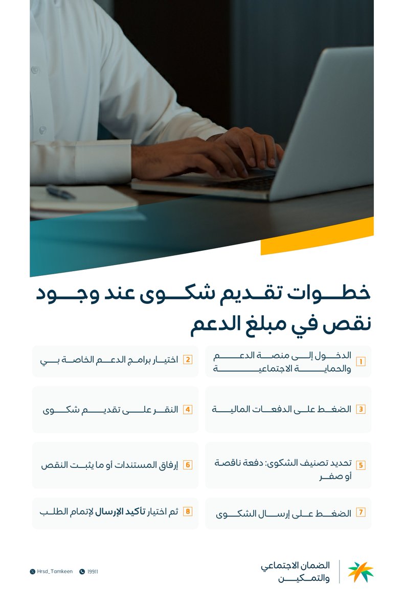 كذلك كشفت الوزارة عن إمكانية تقديم شكوى في حالة نقص مبلغ الضمان الاجتماعي على أن يكون ذلك بعد انقضاء فترة إيداع مبلغ معاش الضمان الاجتماعي لشهر ديسمبر 2025، وذلك يتم من خلال الخطوات التالية: