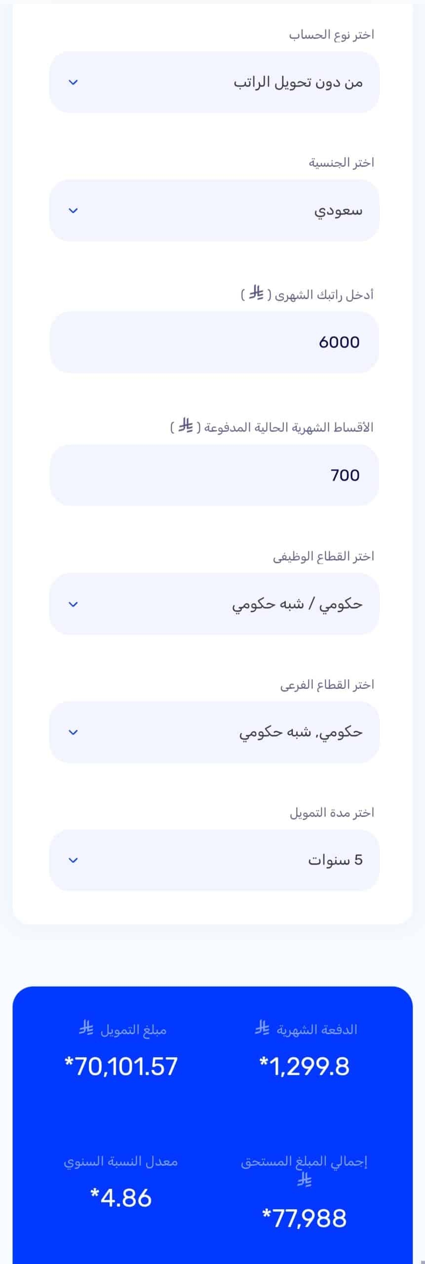 - فترة التمويل ستكون على مدار 5 سنوات بقسط شهري 1300 ريال سعودي.