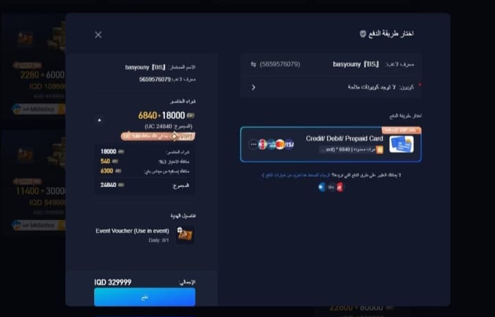 - من أجل تأكيد عملية الشحن فإنه يتطلب منك أن تقوم بإدخال الطريقة المناسبة للدفع، وذلك من أجل ضمان عملية شحن الشدات ودخولها إلى رصيدك.
