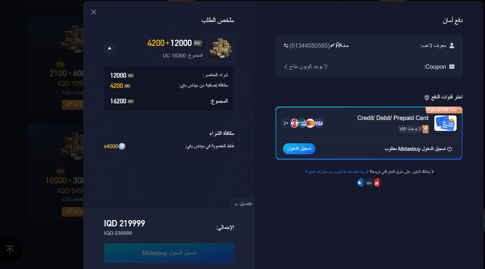 يوفر موقع ميداس باي عرضًا للاعبين الراغبين في زيادة الشدات بسرعة وبأعلى قيمة مقابل المال، حيث يمكن الحصول على 12000 شدة UC بالإضافة إلى 4200 شدة مجانية مقابل 219.999 دينار عراقي فقط، مما يمنح اللاعبين فرصة ذهبية لتجربة المزيد من محتوى اللعبة، وفتح الصناديق المميزة، والاشتراك في الفعاليات الموسمية دون أي قيود.