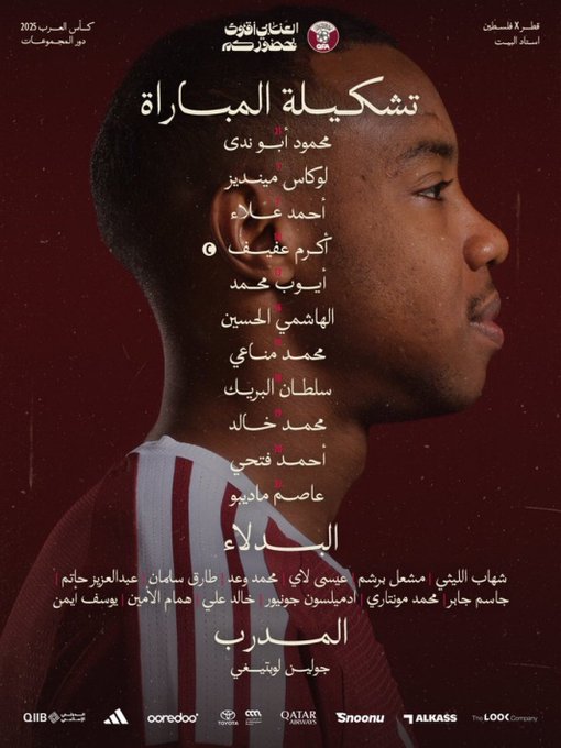 تم الإعلان قليل وقبل انطلاق مباراة افتتاح كأس العرب 2025 والمقاة على ملعب البيت بين منتخبي قطر وفلسطين بعد افتتاح عالمي ولا أروع، عن تشكيلة المنتخبين في أولى مواجهات البطولة:، وجاء تشكيل منتخب قطر كما في الصورة.