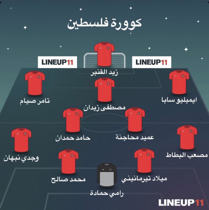 يخوض المنتخب الفلسطيني واحدة من أقوى مباريات المجموعة أمام المنتخب القطري، بالاعتماد على هذا التشكيل الذي يعبر عن قوة المنتخب الفلسطيني وخصوصا في غياب وسام أبوعلي والحملاوي: