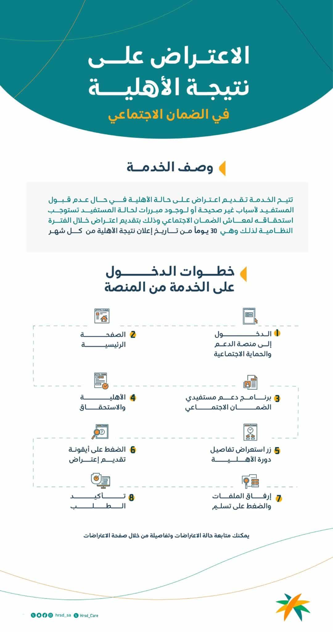 يتيح برنامج الضمان الاجتماعي للمستفيدين تقديم اعتراض على نتائج الأهلية خلال فترة تبلغ 30 يوم من تاريخ إعلان النتيجة عن طريق اتباع الخطوات التالية: