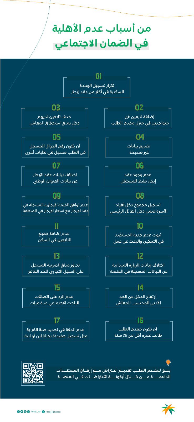 تظهر نتيجة عدم الأهلية في الضمان الاجتماعي لعدد من الأسباب التي أوضحها الحساب الرسمي للبرنامج ومن أبرز هذه الأسباب: