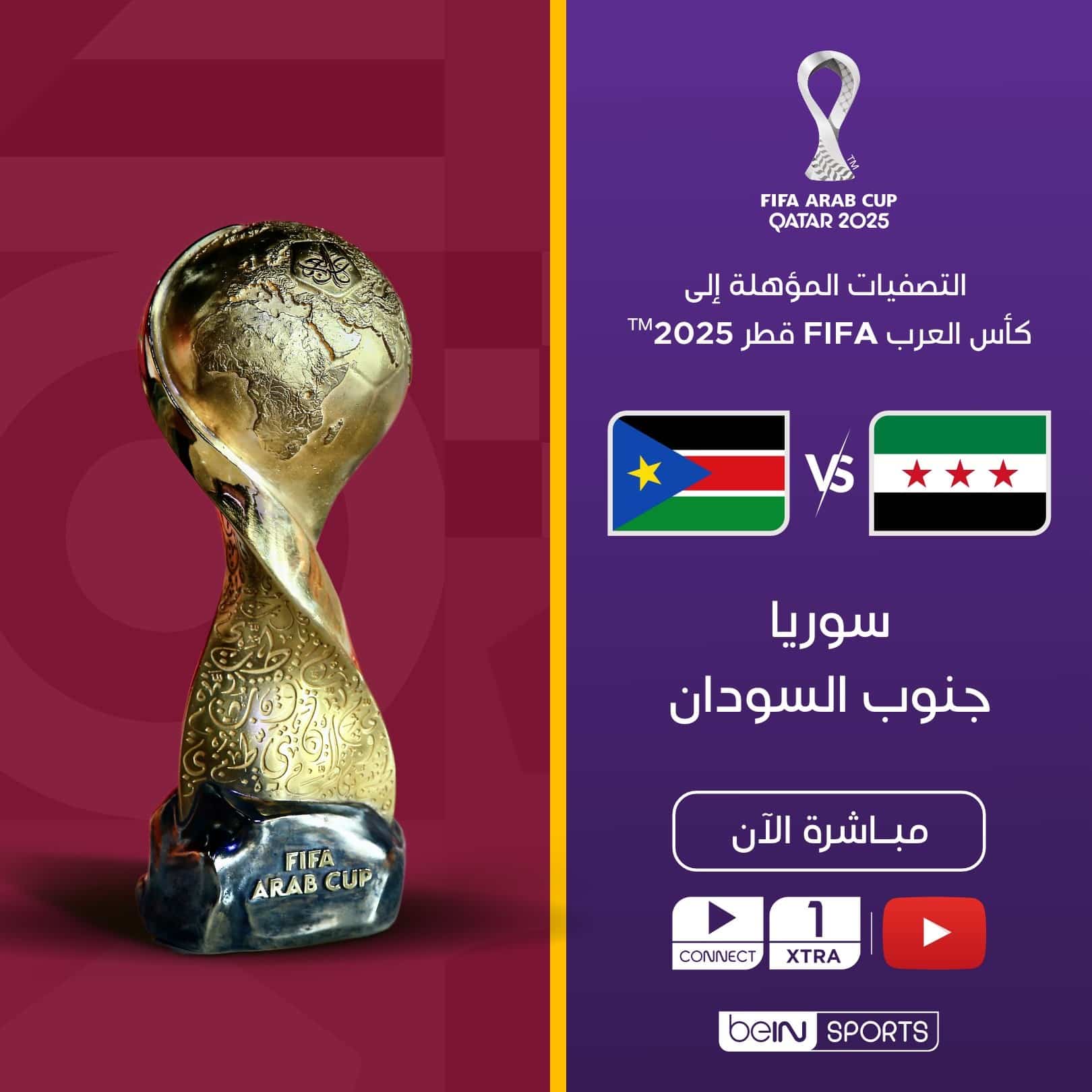تنطلق مباراة الجولة التأهيلية الأولى من الملحق المؤهل لبطولة كأس العرب 2025 من مدين الدوحة بقطر مساء اليوم الثلاثاء الموافق 25 من نوفمبر 2025 بمباراة قوية تجمع بين منتخب سوريا ومنتخب جنوب السودان، حيث يبدأ حكم المباراة في إطلاق صافرته في تمام الساعة السادسة مساءً 6:00 بتوقيت مصر، وفي الساعة السابعة مساءً 7:00 بتوقيت السعودية وسوريا وقطر.