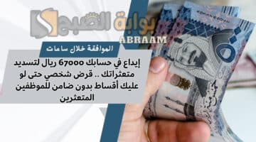 إيداع في حسابك 67000 ريال لتسديد متعثراتك .. قرض شخصي حتى لو عليك أقساط بدون ضامن للموظفين المتعثرين