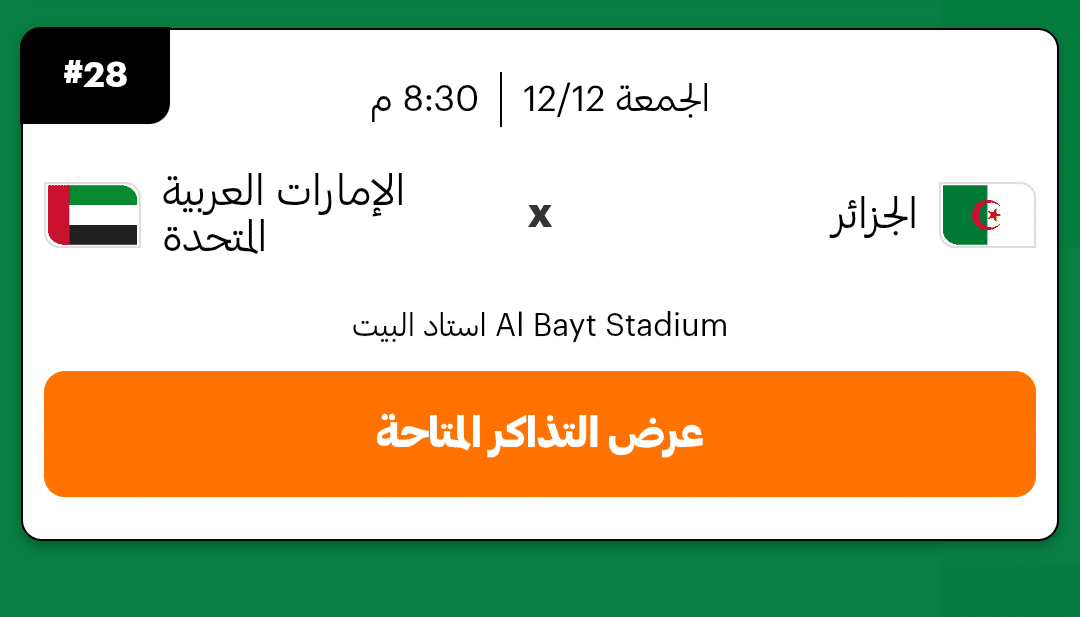- أولاً، قم بالنقر على رابط حجز تذاكر مباراة الإمارات ضد الجزائر.