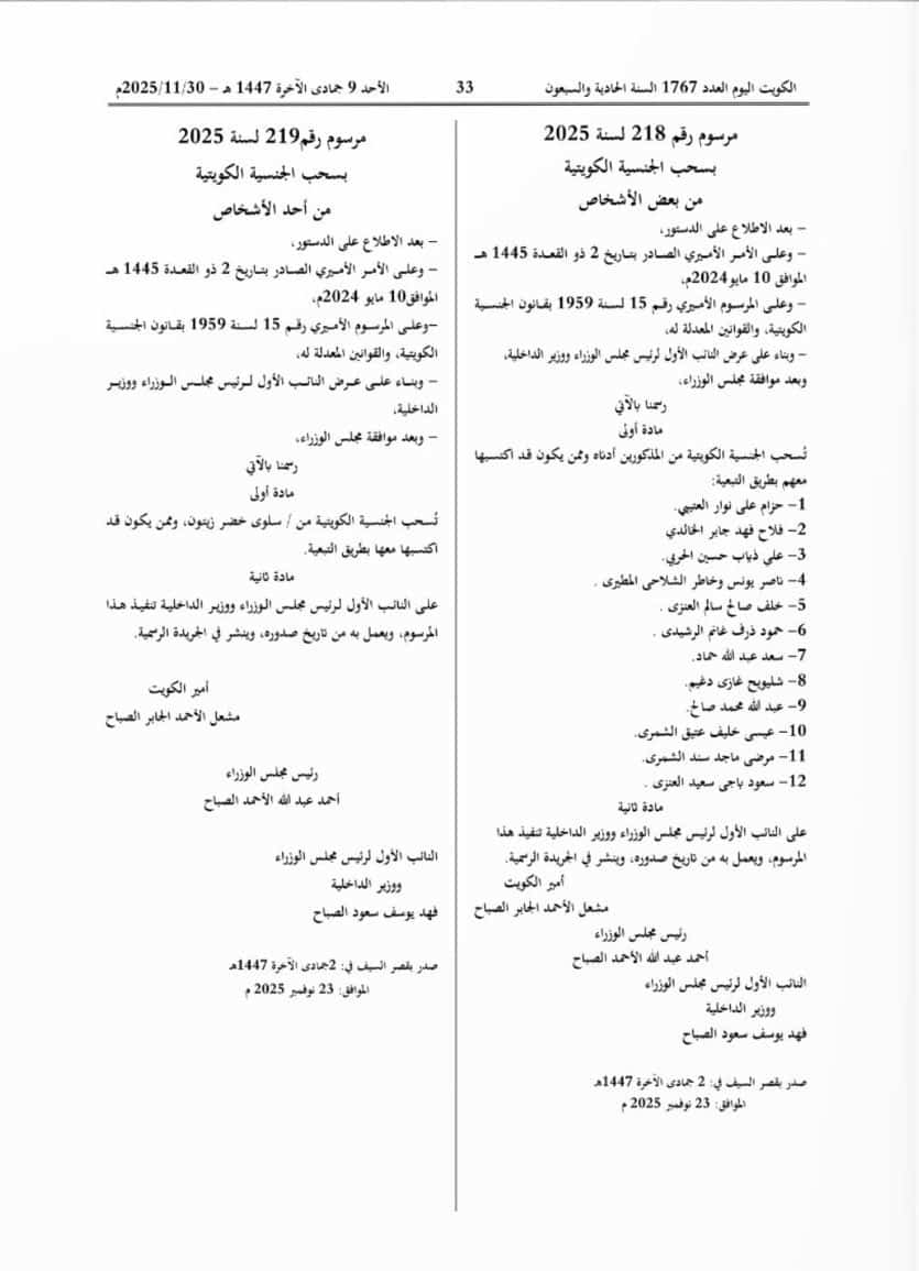 سحب الجنسية الكويتية من 14 شخصاً وممن اكتسبها معهم بالتبعية ونشر أسمائهم في الجريدة الرسمية ضمن 3 مراسيم. pic.twitter.com/efdGnFsSFD